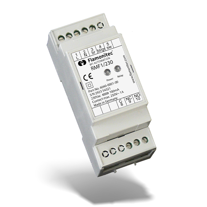 The relay module for flame monitors protects itself and the flame sensor connected to it with its internal fuse in the L1 (or 24 V =) line. The RMF indicates its own operational readiness via a green LED and the switching status of the flame relay via the yellow LED. Its internal flame relay is insulated and has a much higher switching capacity than the flame relay of the flame detector, for example the KLC x or IFx 10 / IFx 11 series.